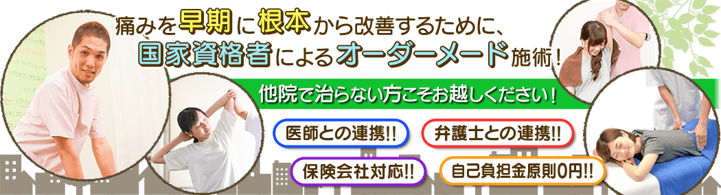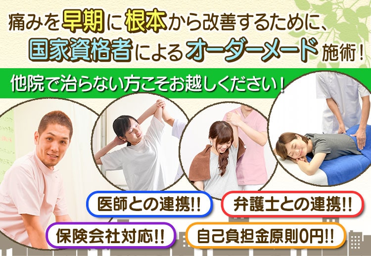 当院では、そのような場合でも、しっかりと施術を受けていただけるよう、むちうち事故に詳しい弁護士の指導のもと、適切に対応させていただきます。
